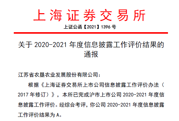 日前,上海證券交易所公布滬市主板上市公司2020-2021年度信息披露工作評價結果,蘇墾農發(股票代碼:601952)獲評最高等級“A”級,是蘇墾農發上市以來連續第二年獲得信息披露工作最高評級。