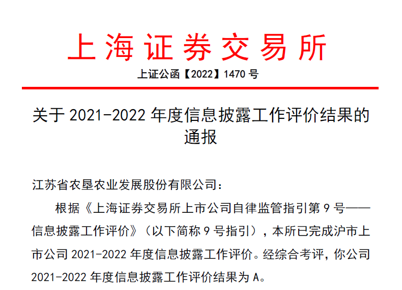 近日,上海證券交易所公布滬市主板上市公司2021-2022年度信息披露工作評價結(jié)果,蘇墾農(nóng)發(fā)(股票代碼:601952)獲評最高等級“A”級,這是蘇墾農(nóng)發(fā)連續(xù)第三年獲得信息披露工作最高等級評價。