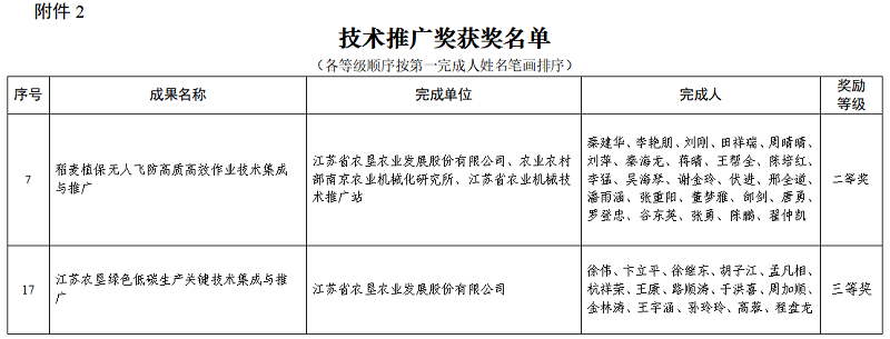 12月11日,第六屆江蘇省農學會科技獎勵成果獎和第六屆江蘇省農學會科技獎勵人才獎獲獎名單公布,蘇墾農發作為第一完成單位申報的“稻麥植保無人飛防高質高效作業技術集成與推廣”成果榮獲技術推廣獎二等獎、“江蘇農墾綠色低碳生產關鍵技術集成與推廣”成果榮獲技術推廣獎三等獎,蘇墾農發現代農業研究院朱松同志榮獲青年科技獎。