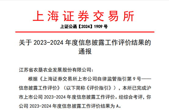 •        近日,上海證券交易所(以下簡稱“上交所”)完成對滬市上市公司2023—2024年度信息披露工作評價,經綜合考評,蘇墾農發(股票代碼:601952)在2023-2024年度上海證券交易所的信息披露工作考核中,獲評最高等級“A”級,上市以來,蘇墾農發連續5年獲此殊榮。